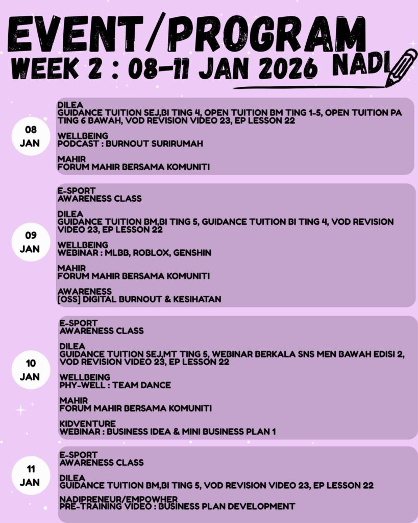 Minggu ini (8โ€“11 Januari 2026) pelbagai aktiviti & program menarik untuk komuniti โ€“ dari DILEA Tuition, E-Sport Awareness, Wellbeing, Mahir Komuniti sehinggalah NADIpreneur!